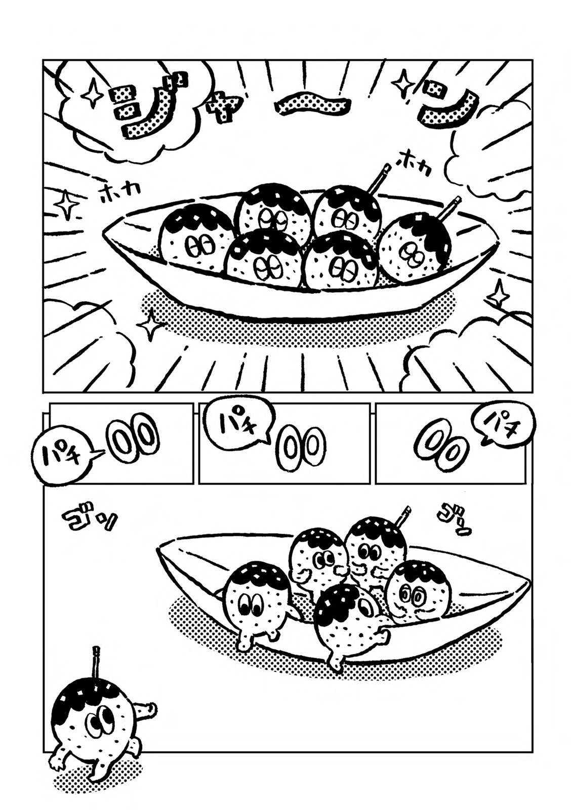 A story of hot and fresh Takoyaki-kun with plenty of sauce on their heads going on a short-lived adventure in the city.